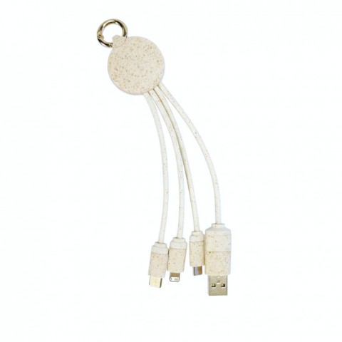 Este cable de carga multifuncional está diseñado para ofrecer practicidad y un compromiso con el medioambiente. Fabricado en paja de trigo, un material sustentable que combina resistencia y bajo impacto ambiental, reemplaza a los plásticos convencionales y aporta un acabado natural muy atractivo. Cuenta con múltiples conectores que lo convierten en una solución universal. Entradas: USB Tipo – A y Tipo-C. Salidas: Lightning (Apple), Micro USB y Tipo-C. Medidas: Largo 16cm – Diámetro 3.5cm. Su diseño compacto con anillo tipo mosquetón metálico permite llevarlo en llaves, mochilas o bolsos, lo que lo hace ideal para viajes y uso diario. Compatible con smartphones, tablets y otros dispositivos electrónicos, permite carga y transferencia de datos de forma rápida y eficiente. Un accesorio práctico, ecológico y versátil para quienes buscan un cable “todo en uno” sin sacrificar estilo ni funcionalidad. Cantidad mínima para aplicación de logos 50 unidades.